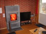 Living/dining room featuring a view towards the lake and direct access to the patio, a flat screen TV with satellite channels, DVD-player, CD-player/radio, and an impressive soapstone fireplace creating a cozy warmth and atmosphere.
