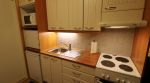 Kitchenette with electric stove, baking oven & range hood, microwave oven, dishwasher, fridge, coffee and tea maker, toaster, a full set of cooking utensils and tableware.